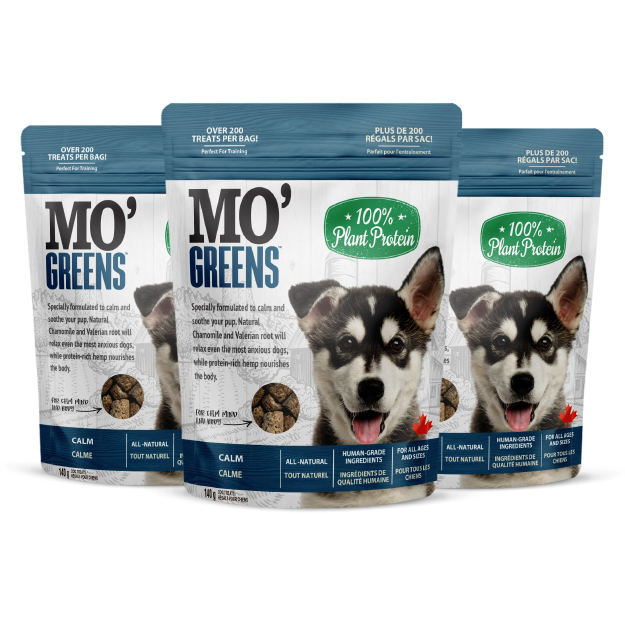 Mo’ Greens CALM dog treats combine 5 wholesome ingredients containing flavours your pup will love. These tasty treats are formulated with Chamomile and Valerian Root to calm and soothe even the most anxious pups. Each batch is made with simple ingredients for great taste, nutrition and quality you can trust.